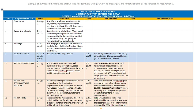 The helps your proposal meet all solicitation requirements. It tracks each requirement and matches it with the corresponding section in your proposal compliance matrix template[13]. This matrix keeps you organized and prevents missing requirements.